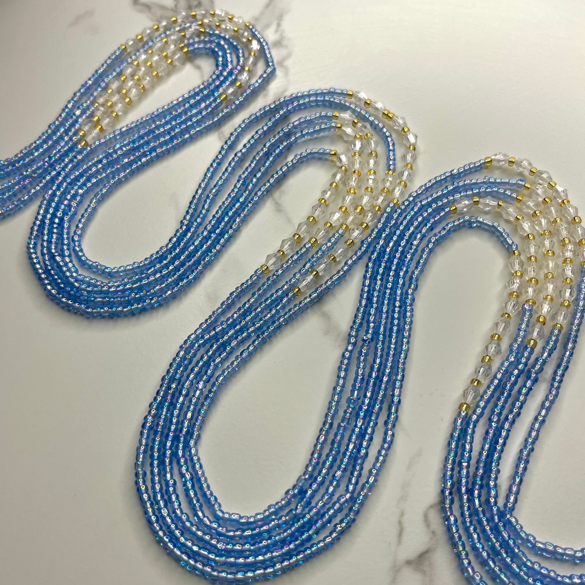 Crafted in reverence to the tradition of intentional adornment, this luminous strand balances soft sky blue, clear crystal, and gold — each element chosen to echo the calm and clarity that come when the spirit is settled.