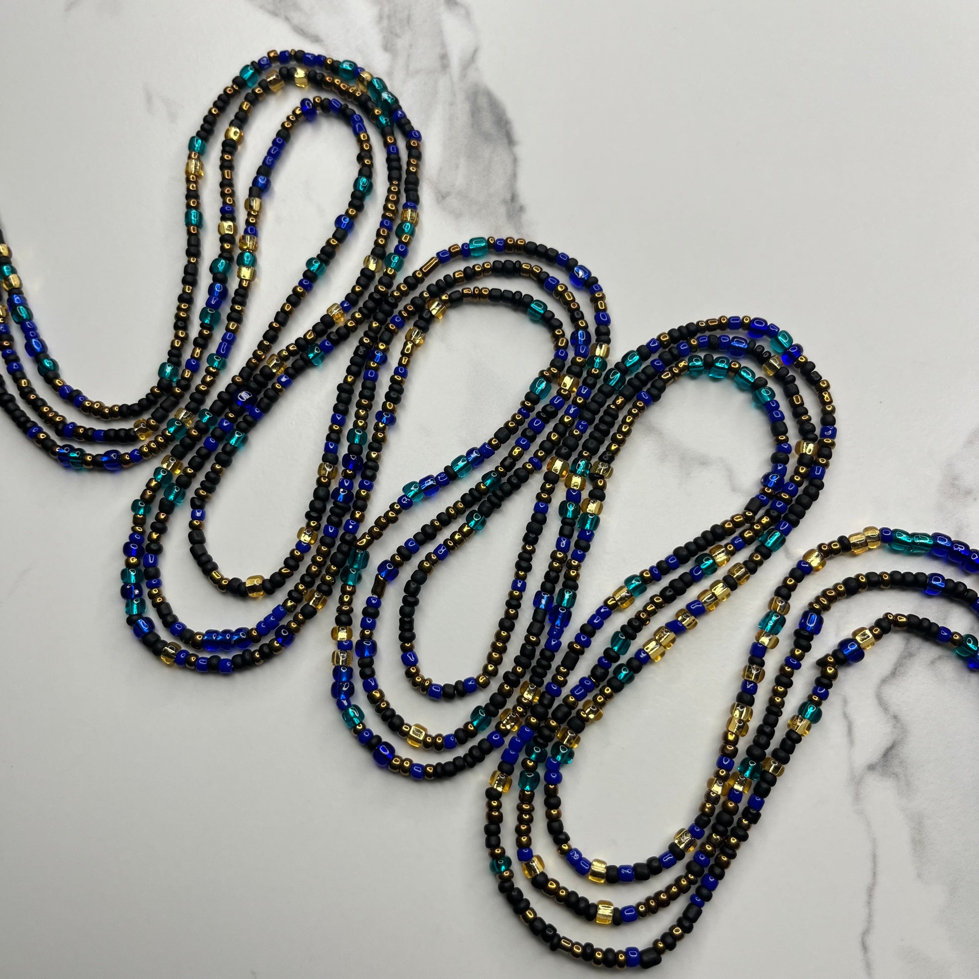 Rooted in the discipline of traditional adornment, this strand honors sovereignty as both spiritual and ancestral. Deep sapphire and teal reflect clarity, intuition, and truth, while black anchors protection and discernment. Gold moves through like lineage—signifying legacy, authority, and divine favor that cannot be borrowed or bought.
